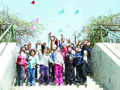 圖三:劇組與老峪溝中心小學的孩子們共同放飛寫有夢想的紙飛機。
