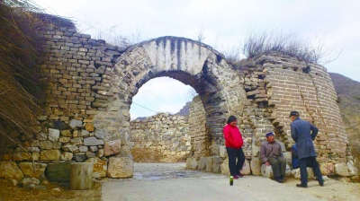 圖七:導演王炳燃在劇中大鵬關原型所在地——長峪城村古長城關口,聽當地村民講古長城的故事。