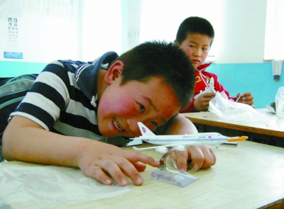 圖八:劇組為老峪溝中心小學孩子們送去了小禮物“飛機模型”,孩子們拿在手里,愛不釋手。