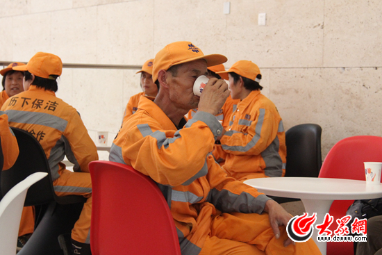 看完畫(huà)展后,環(huán)衛(wèi)工人們?cè)诳Х劝尚菹ⅰ⒚赓M(fèi)飲水 記者 馬俊驥 攝