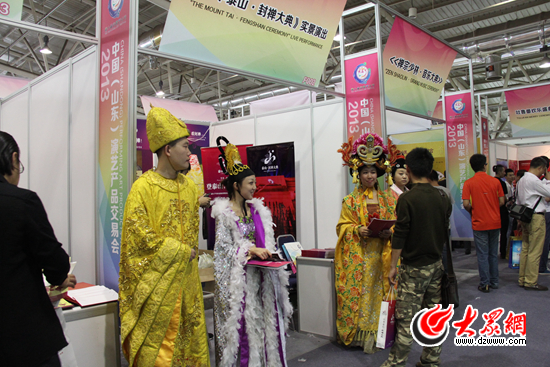 大眾網濟南10月12日訊(記者 馬俊驥)在今天上午開幕的“十藝節”中國(山東)演藝產品交易會上,一隊“皇家組合”引來眾多目光。四名演員身穿宮廷服飾,推介《中華泰山·封禪大典》演出項目,讓不少人笑稱:“唐高宗和武則天來‘十藝節’了。”