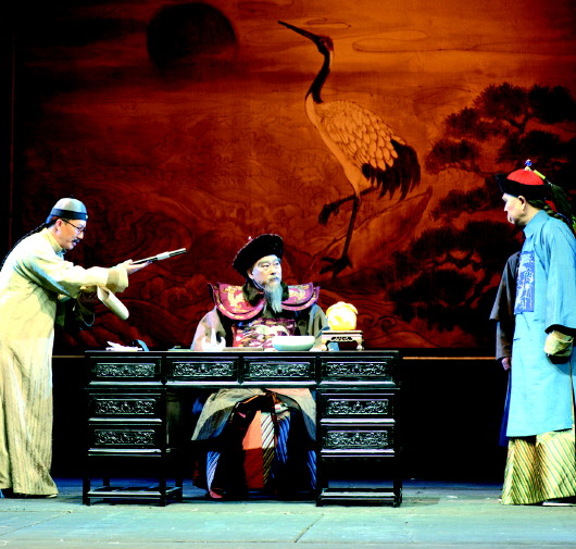 支撐起這部戲的三個主要人物嚴(yán)復(fù)、李鴻章、賈吳官的演員表演應(yīng)該說是非常稱職的。張林所扮演的嚴(yán)復(fù),由出場時年輕氣盛所導(dǎo)致的清孤自傲和桀驁不馴,至不得志而沉淪,成為“癮君子”;從抱有“報國”情懷的青年才俊到逐漸成為通達(dá)世事人生的哲人,其心理路程和戲劇動作行為線脈展示得非常清晰,且賦予了其鮮明的個性、血肉,可信,可愛,可敬;而顏勤所飾演的賈吳官,則把晚清官場中的一個良知并沒有泯滅、為了生存而不得不在某些方面奴顏婢膝、但卻狡黠通達(dá)的性格,刻畫得非常傳神,從而給觀眾留下了深刻的印象,頗獲好評。