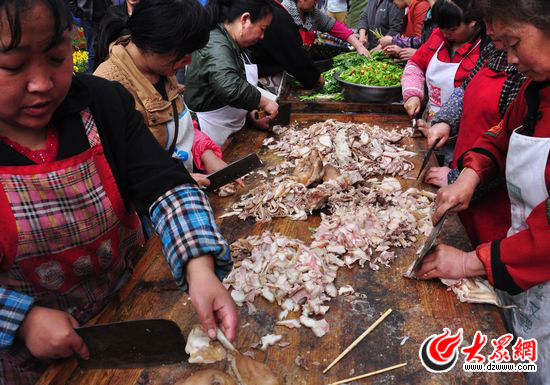 “這些豬頭肉有的是村民從自己家里拿過來的,也有的是村集體把殺好的豬抬過來的,大家聚在一起一塊做成紅燒肉。”一名姓李的當地群眾告訴記者,現在是特殊時候,大家更要一起共度難關。下午5:30,大家把做好的回鍋肉端上來,圍在一起坐下邊吃邊聊,像是一個大家庭一般。(大眾網特派記者