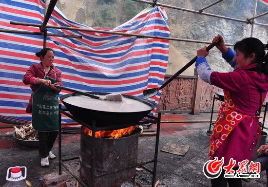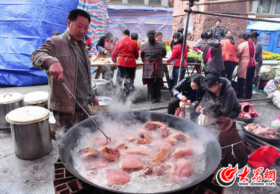 大眾網寶興4月22日訊 今天上午,大眾網特派記者趕赴雅安市寶興縣。目前,寶興縣受災群眾的生活也漸漸步入正常,在一個臨時搭建的帳篷內,20多個受災群眾一起吃大鍋飯。當天下午5:30,他們還吃上了大鍋燒制的紅燒肉。