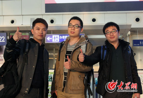 大眾網(wǎng)3名特派記者尹海洋、盛堃、李兆輝(自左至右)準(zhǔn)備登機(jī)飛赴四川