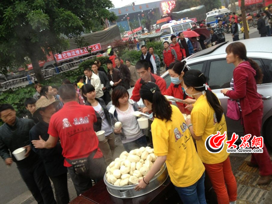 23日早,蘆山縣城區(qū)及周邊震區(qū)群眾冒雨在街頭領(lǐng)饅頭。特派記者 李兆輝 攝
