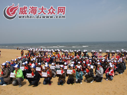 4月21日上午10時許,來自威海市各個單位、部門的志愿者們在威海國際海水浴場的海灘上,自發組織為四川雅安祈福,F場,近百名兒童和青年志愿者們,高舉“雅安加油”的紙張,手里的五星紅旗也迎風飄揚。