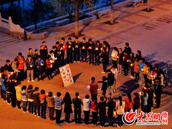 當晚7時左右,在德州學院體育館廣場中央,地理系56名學生代表用數百支蠟燭圍成一個心型形狀,并在“心”內同樣用蠟燭圍出“4·20”的數字,借此形象地傳達著56個民族“心系災區,情牽災民,心星相映,以愛導航”的心愿。隨后,參與悼念活動的大學生們聲情并茂地朗誦了賑災詩歌,為遇難同胞默哀三分鐘,以表達對雅安同胞的深切關懷之情。
