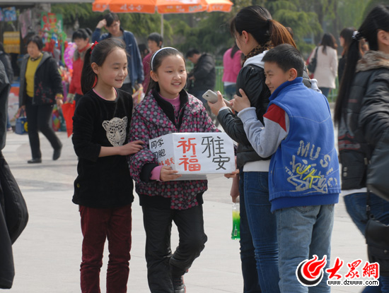 今天下午1點,學生、老師和家長們一起來到泉城廣場,20多名身穿校服的小學生手捧手寫“祈福雅安”的自制募捐箱,向路過的行人和游客募集善款,支援雅安震區。少至1角的紙幣、鋼镚,多至50元、100元紙鈔,在不到1個小時的時間里,300多位愛心人士慷慨解囊,把20多個紙質的募捐箱裝得滿滿當當。