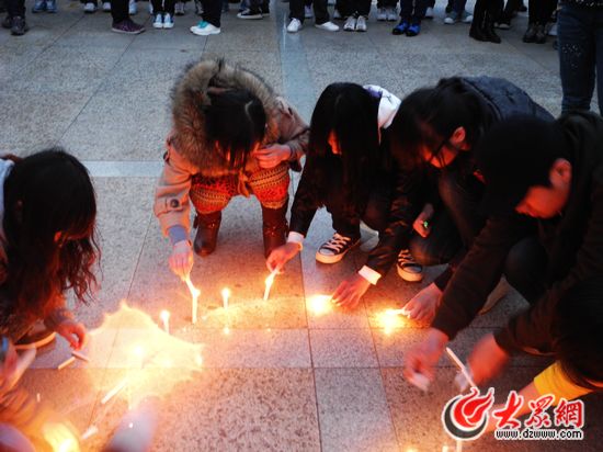 圍成心形點(diǎn)燃蠟燭 日照700名大學(xué)生雨中為雅安祈福