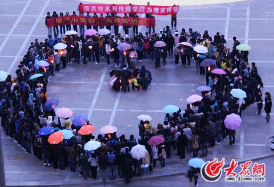 22日18時(shí)許,曲師大日照校區(qū)700多名學(xué)生聚集在該校日月廣場圍成“心”形,點(diǎn)燃蠟燭,冒雨共同為雅安祈福。