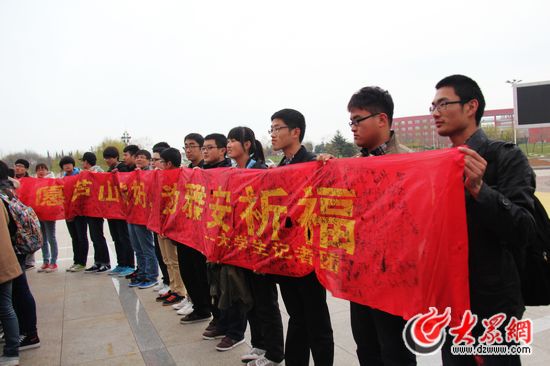 22日18時(shí)20分,記者來到曲阜師范大學(xué)日照校區(qū)時(shí),日月廣場了已經(jīng)聚集了300多名大學(xué)生。10多名學(xué)生舉著寫有“愿蘆山安好,為雅安祈福”的條幅,條幅上寫滿了學(xué)生們的簽名。