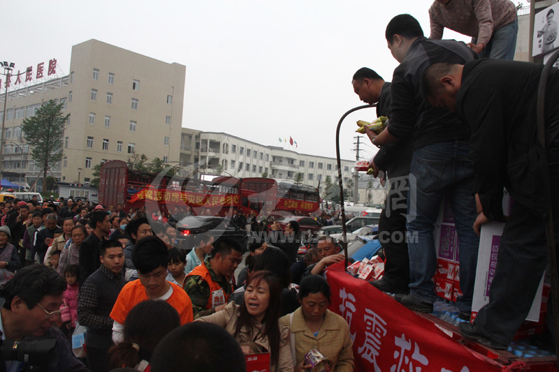 今天早上,千余名蘆山縣受災群眾在街頭排起數百米的長隊,領取食品。大眾網特派記者 攝