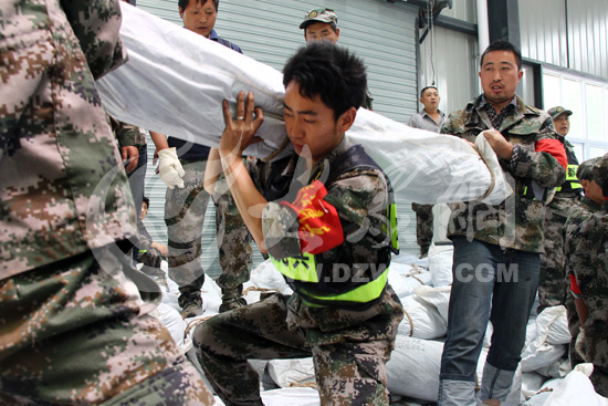 幾十斤的帳篷支架被民兵用肩膀扛到了運輸車上。大眾網特派記者尹海洋 攝