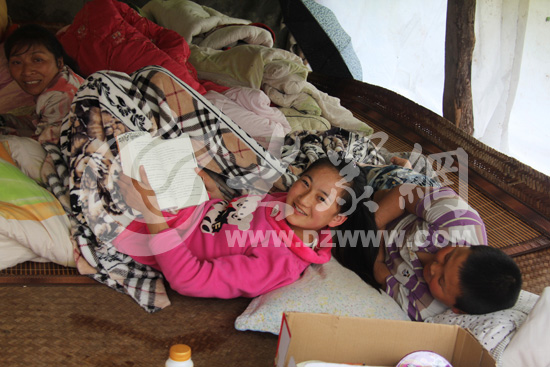 24日,龍門鄉青龍村外的帳篷里,小女孩靜靜正在看課外讀物。大眾網特派記者 攝