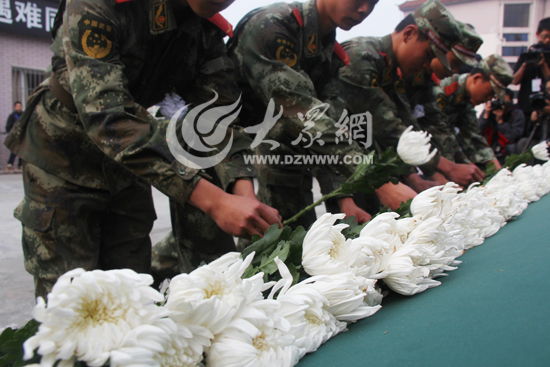 參與救援的戰士為遇難者獻花。大眾網特派記者 攝