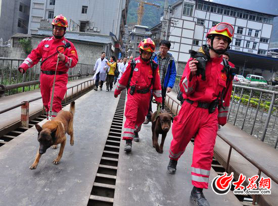 大眾網寶興4月22日訊 22日下午,大眾網特派記者反復輾轉,終于深入到雅安地震震中區——寶興縣。一度成為“孤島”的寶興縣,今天下午道路終于被救援隊員搶通了。記者在寶興縣看到,國家救援隊派出4條警犬用于搜救,爭分奪秒地抓住黃金救援時間。