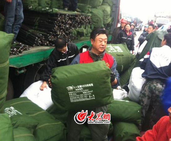 大眾網濟南4月23日訊(記者 王磊)“我們已抵達蘆山縣,今天與藍天救援隊一起裝卸救援物資。”今天下午,在蘆山縣第三小學附近的救援物資轉運站,山東公益救援分隊汲春鋒等3人已冒雨奮戰了8個小時,凌晨隨救援車隊進入震區后,他們僅休息了不到3個小時,就立即加入到了裝卸救援物資的隊伍。