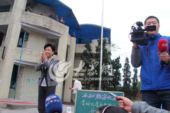 四川省副省長黃彥蓉在升旗儀式上宣布,首所震區學校正式復課。大眾網特派記者 李兆輝攝