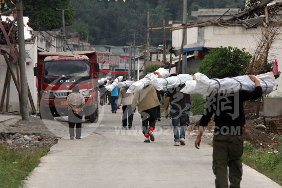 下午三點鐘,兩輛軍用卡車的發動機聲把中壩村的村民引到了街頭。駐扎中壩村的成都軍區鐵拳師雷霆團的40多名官兵迅速出動,只用了20分鐘就完成卸貨。楊平拿著對貨單,忙著清點數量,對接物資。此時,中壩村12個組的組長已經帶著村民趕來,有的騎著摩托,有的推著小車、騎著三輪。