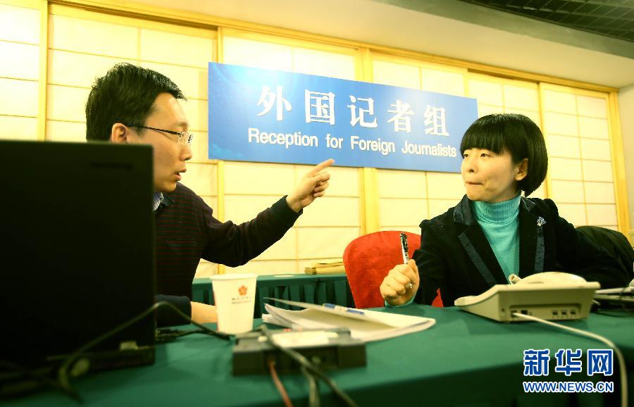 2月26日,在2014年全國兩會新聞中心,外國記者組的兩名工作人員在交談。當日,設在北京梅地亞中心的2014年全國兩會新聞中心正式啟用,中心工作人員開始接待和安排中外記者采訪。
