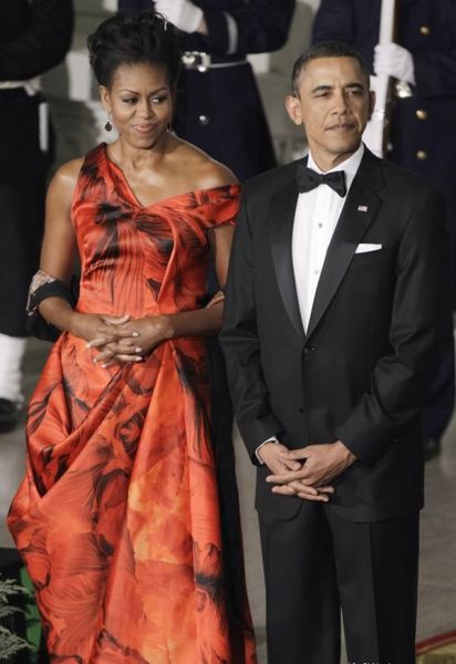 日前,美國第一夫人米歇爾奧巴馬在出席為招待中國國家主席胡錦濤而設立的歡迎國宴上,身著Alexander McQueen 2011的夢幻蠶絲鑲黑色花瓣的紅色禮服。2009總統就職晚會,身著Jason Wu白色雪紡單肩禮服 4.2011年中國國家主席歡迎國宴,身著Alexander McQueen禮服,搭配Kimberly McDonald珠寶。