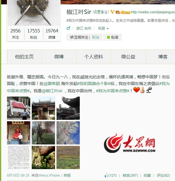 葉展源:#我為中國來點贊#是9月18日發(fā)起的,當時的倡議是:#我為中國來點贊#無論你在哪里?無論你在何行業(yè)?無論你年青陽光還是歷經(jīng)風(fēng)霜?你對于祖國都會有一份誠摯的感情!對身邊的精彩人物、英雄事跡、大好河山、燦爛文化都會有自己的看法!讓我們一起來#我為中國來點贊#!抵御外辱、精忠報國。今日九一八,我在戚繼光紀念館,緬懷抗倭英雄,暢想中國夢!勿忘國恥,點贊中國!在@雷希穎 海外發(fā)起#我和國旗合個影#后,我在中國東海之濱倡議#我為中國來點贊#。我是@椒江葉sir ,我在中國臺州,#我為中國來點贊#!