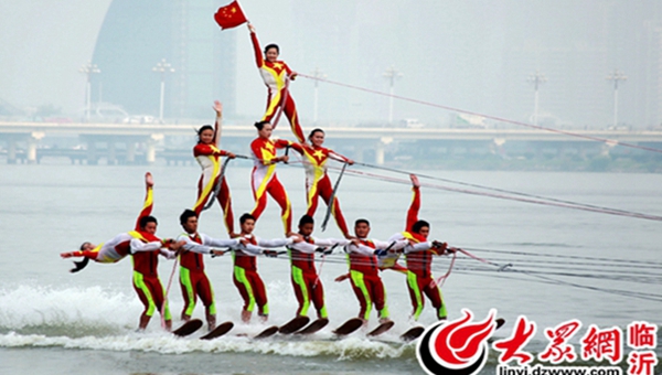 中國滑水運動員在臨沂沂河南湖心島水運賽場用藝術滑水表演的形式和國旗合影,為中國點贊。