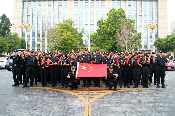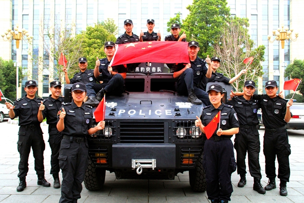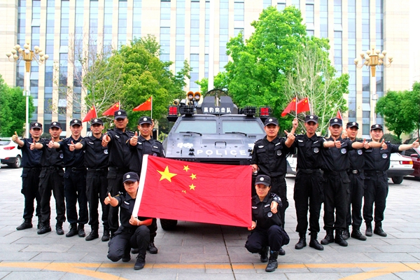 臨沂市公安局特警支隊隊員與國旗合影,為中國點贊。