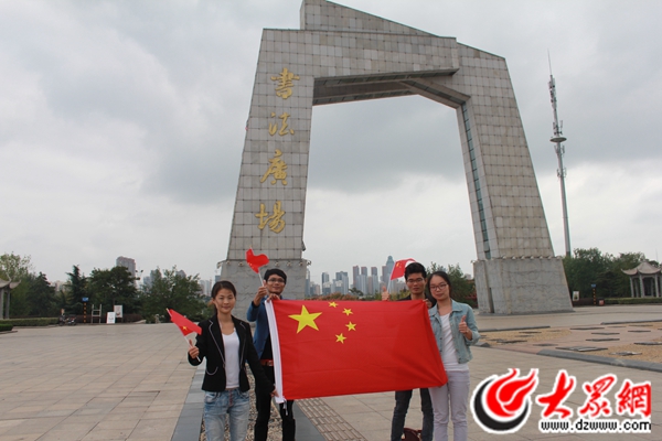 臨沂一中學生在臨沂人民廣場'山高水長'前與國旗合影為中國點贊