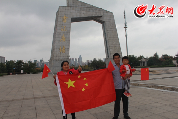 9月29日上午,來自武漢、河南的4名游客,在臨沂書法廣場與國旗合影。