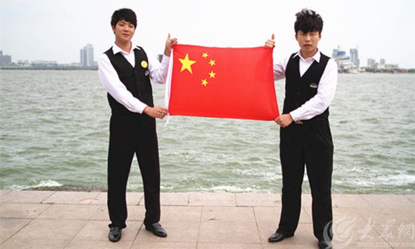 游客在龜蒙景區與國旗合影,為中國點贊。