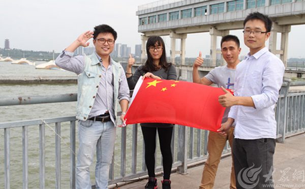臨沂市民在臨沂沂河橡膠壩與國旗合影為中國點贊