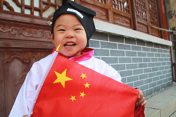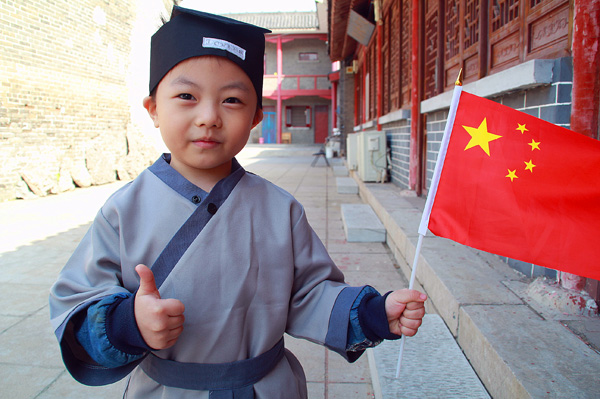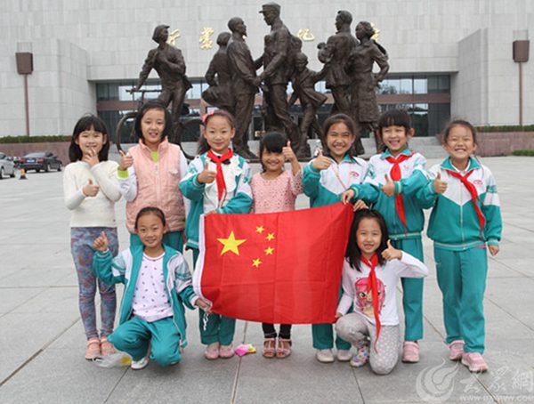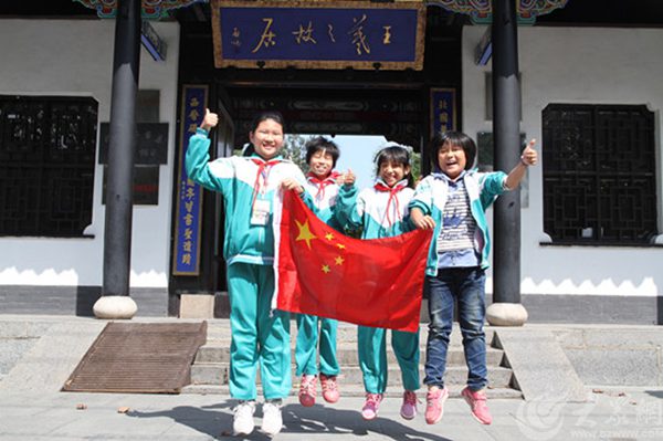 臨沂小學生在臨沂羲之故居與國旗合影為中國點贊