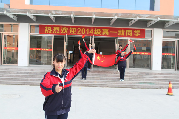 臨沂七中高二五班學生李婧語與同學們在臨沂七中教學樓前與國旗合影為中國點贊