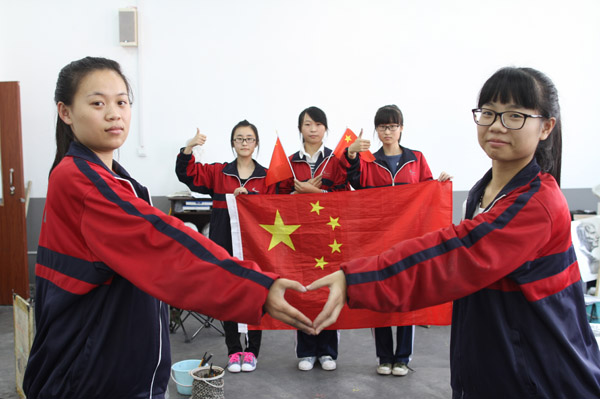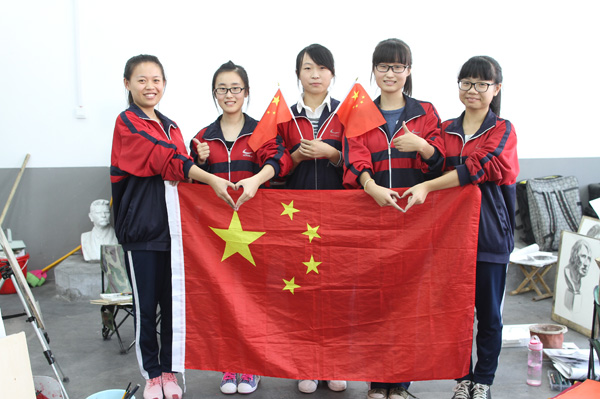 臨沂七中美術特長生在畫室與國旗合影為中國點贊