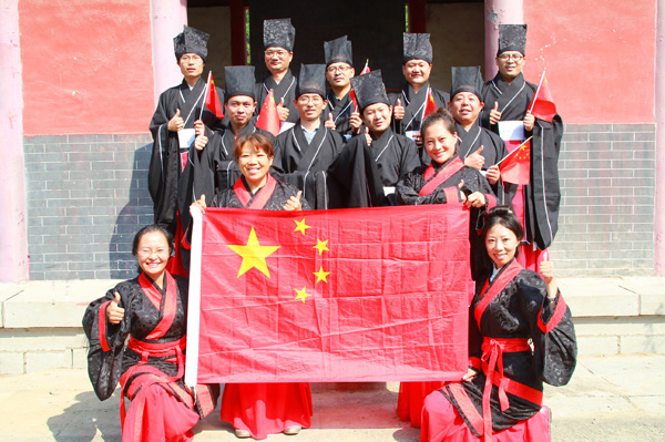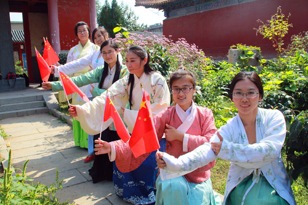 臨沂漢服社成員與國旗合影,為中國點贊