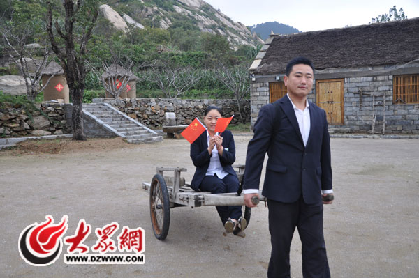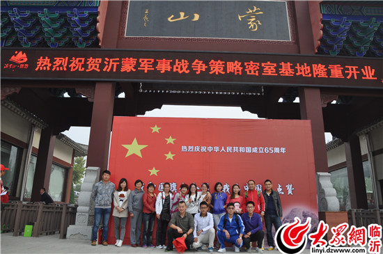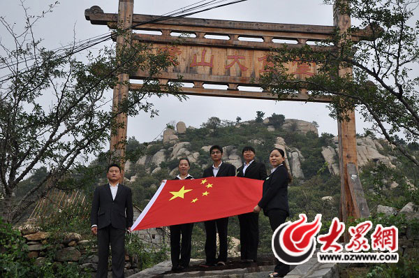 沂蒙山旅游去龜蒙景區工作人員在蒙山山門前合影,為中國點贊。