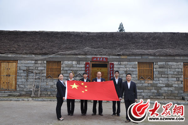 臨沂沂蒙革命紀念館工作人員在紀念館前與國旗合影為中國點贊