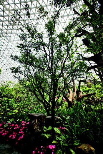 走進植物館沙生植物區,仿照熱帶荒漠景觀營造的沙礫地貌上,矗立著高大挺拔的仙人柱、渾圓帶刺的仙人球、排排如扇的仙人掌。穿過這個區域,高大的加拿利海棗及中東海棗組群呈現于眼前,下方是由朱蕉、雪花木、孔雀木及蕨類等植物組成的灌木群。游客步入其間,就好像置身熱帶雨林,異域風情撲面而來。