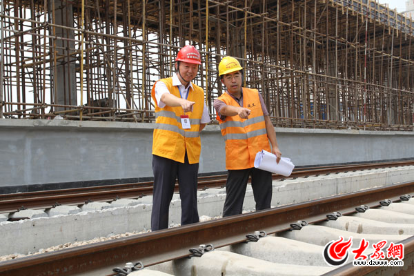 邵立軍(左)勘察站臺施工情況