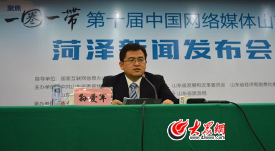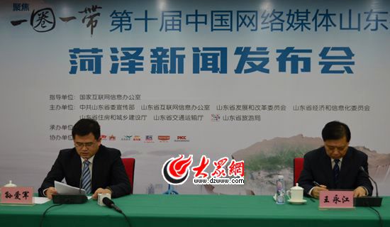 今天下午,“聚焦‘一圈一帶'——第十屆中國網絡媒體山東行”召開菏澤市新聞發布會,菏澤市委副書記、市長孫愛軍就菏澤經濟社會發展情況進行主題發布,菏澤市委常委、宣傳部長王永江主持發布會。
