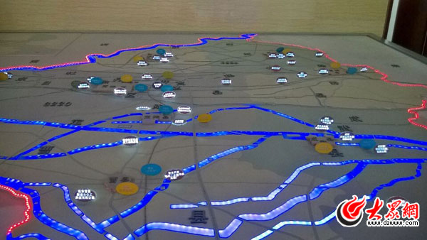 菏澤在全市范圍內(nèi)對影響大氣環(huán)境質(zhì)量的所有污染源開展排查摸底。在菏澤市環(huán)保局門口,重點污染源被標注在電子沙盤上,一目了然。記者 馬俊驥 攝。