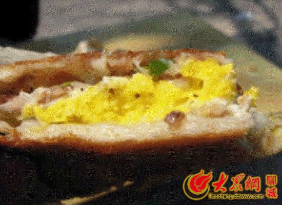 大眾網聊城5月5日訊 在聊城,很多人的一天是從吃一口呱嗒開始的。來到早餐攤邊,買一個熱騰騰的呱嗒,用油紙包了,攔腰切開,露出雪白的蛋清、金燦燦的蛋黃,夾雜著香飄四溢的肉粒,深吸一口氣,聞聞從指縫間飄散出來的蔥花香,整個人瞬間精神“倍兒爽”。