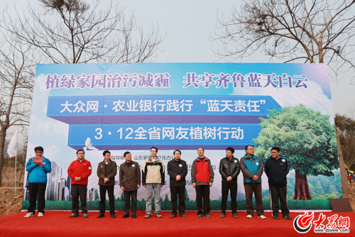 在啟動儀式上,大眾網作為主辦方致辭:“作為山東新聞第一網,大眾網自創辦以來始終熱心公益事業,把社會責任放在首位。2009年以來,大眾網攜手農業銀行山東省分行已發動數千萬網友在山東省17地市,種植樹木累計近百萬棵,為生態山東貢獻力量!苯裉欤蟊娋W繼續攜手農業銀行山東省分行,以對抗“大氣污染”為己任,在全省17地市發動網友踐行“藍天責任”,植綠家園治污減霾,共享齊魯藍天白云。