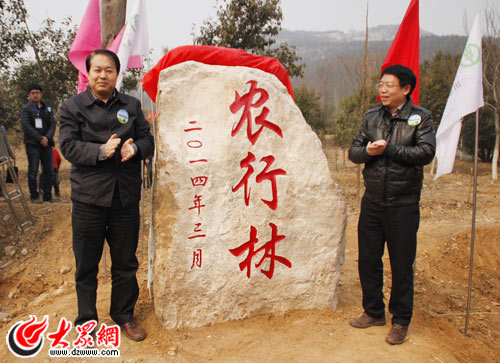 山東省委宣傳部副部長劉致福(左一)和中國農業銀行山東省分行副行長鄭祖剛為“農行林”揭幕。(記者 何泉峰 攝)