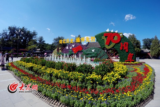 9月2日中午,圓明園門口的主題花卉在“閱兵藍”映襯下格外美麗。(大眾融媒體報道組記者 攝)