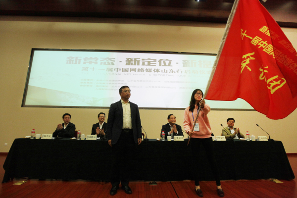 中共山東省委宣傳部副部長、山東省互聯網信息辦公室主任李建軍為采訪團授旗,采訪團成員代表孔唯千接旗,“新常態·新定位·新提升——第十一屆中國網絡媒體山東行”大型采訪活動正式啟動。