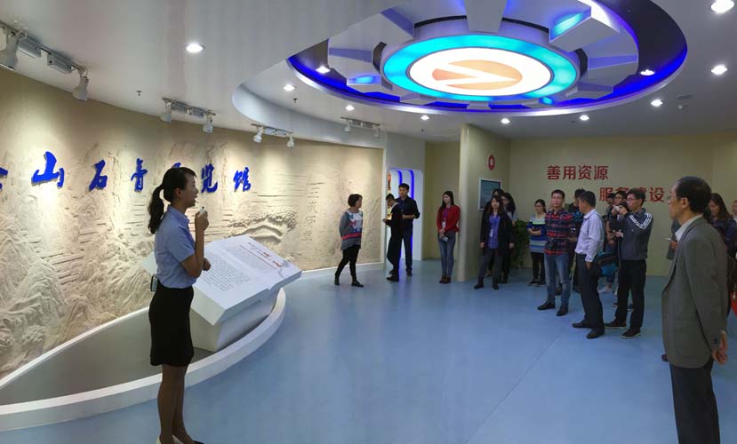 在泰山石膏展覽館里,各種石膏板裝修材料顏色鮮艷、式樣繁多,引起了采訪團成員的濃厚興趣。