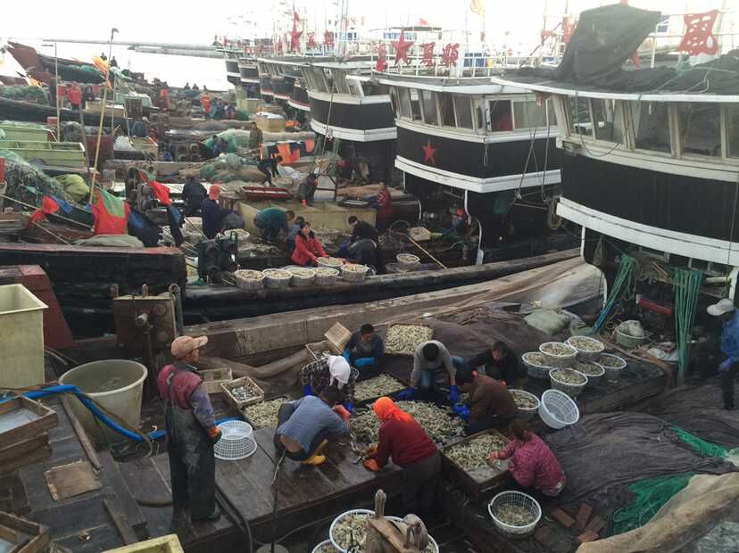 船老大們洋溢著幸福的笑容,把一船船活蹦亂跳的蝦虎和魚蟹搬上岸。